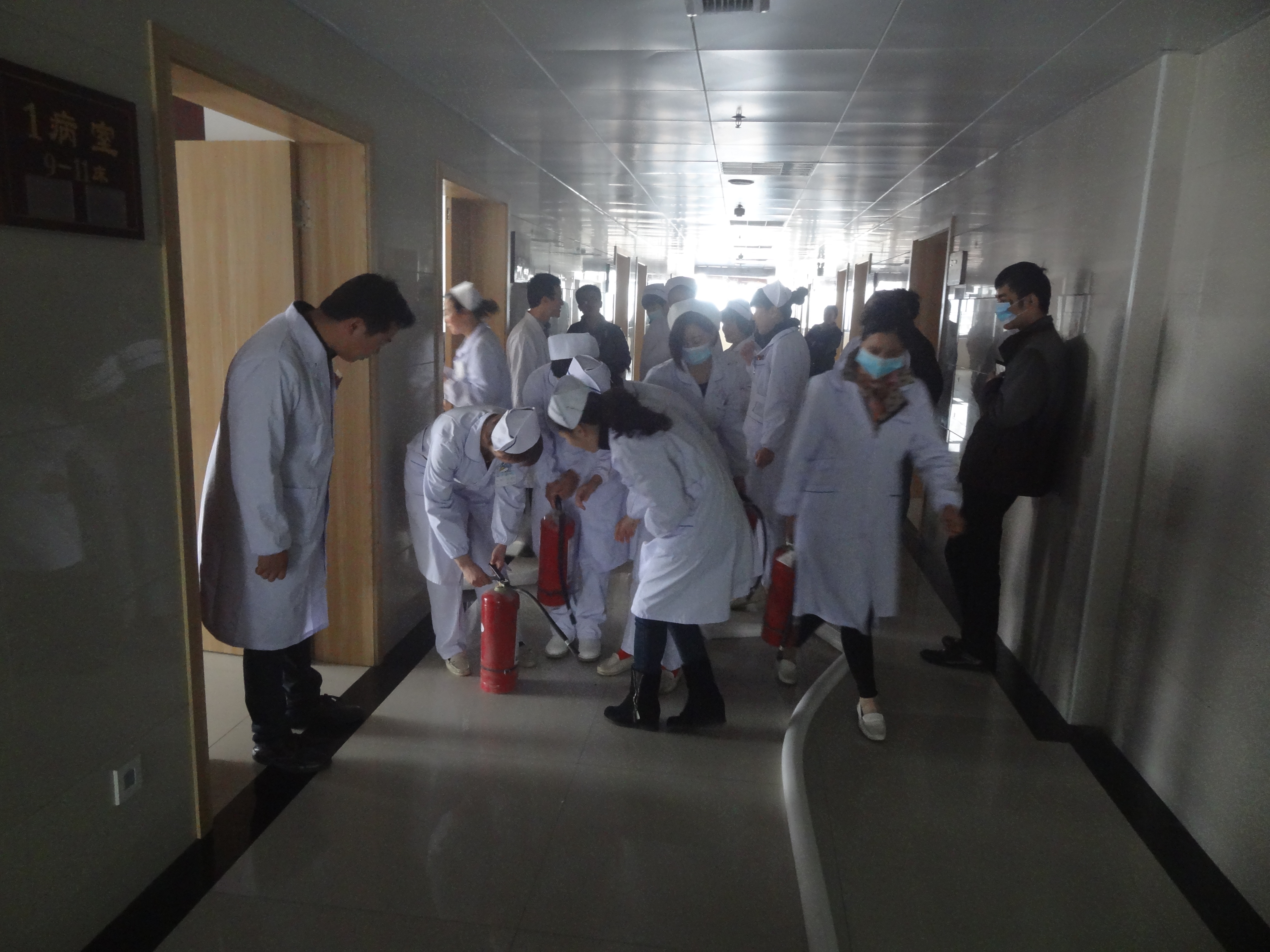 演练分为室内制造火警信号、初期火灾灭火器使用、室内消火栓灭火模拟、消防烟雾实景扑灭、人员疏散撤离、急救等几个部分。演练中,医院义务消防队迅速集合,及时到达现场,果断处理问题;职工们沉着、冷静,采取措施有效,真正把消防“四懂四会”能力运用到实战中。