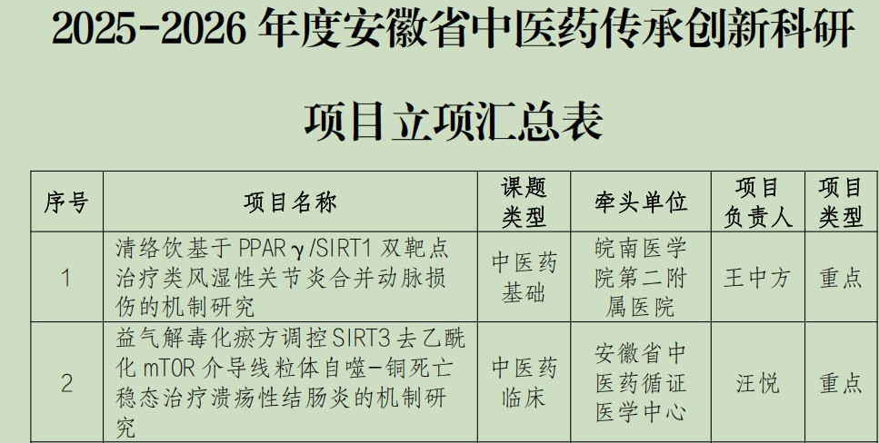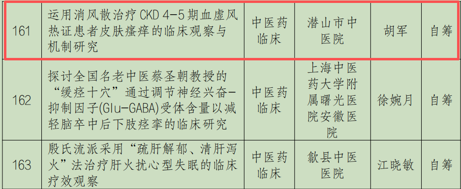 近日,从安徽省中医药管理部门传来喜讯,由我院肾内科主治医师胡军作为项目负责人申报的科研课题——《运用消风散治疗CKD4-5期血虚风热证患者皮肤瘙痒的临床观察与机制研究》,经过多轮严格评审,成功获批“2025-2026年度安徽省中医药传承创新科研项目”立项。这一成绩标志着我院在临床科研领域取得了新的突破。