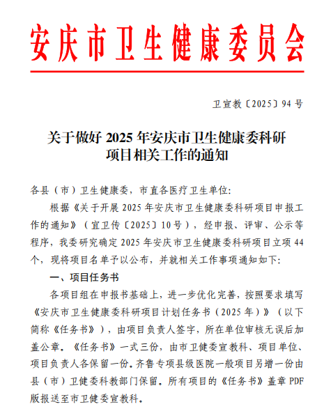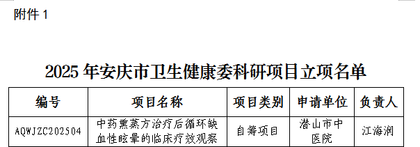 近日,安庆市卫健委正式公布了2025年度科研课题立项名单。经单位推荐、专家严格评审及层层遴选,我院急诊科主任江海润同志作为项目负责人申报的课题——《中药熏蒸方治疗后循环缺血性眩晕的临床疗效观察》,在众多申报项目中脱颖而出,成功获批立项。