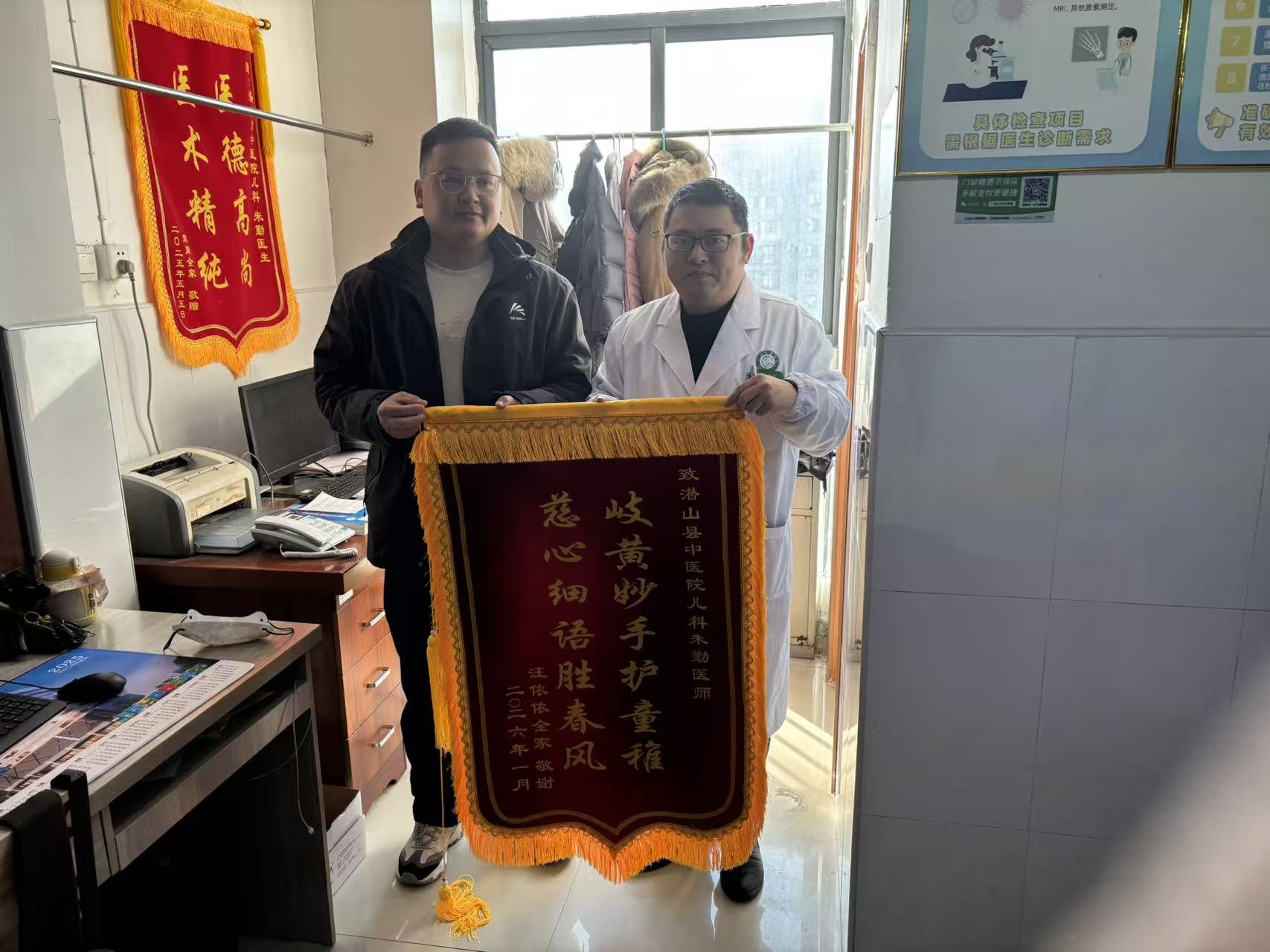 近日,潜山市中医院儿科病区暖意融融。五岁患儿依依的家人将一面绣有 “岐黄妙手护童稚,慈心细语胜春风” 的鲜红锦旗,郑重送到朱勤医师及其团队手中,以此表达对医护人员的诚挚谢意。