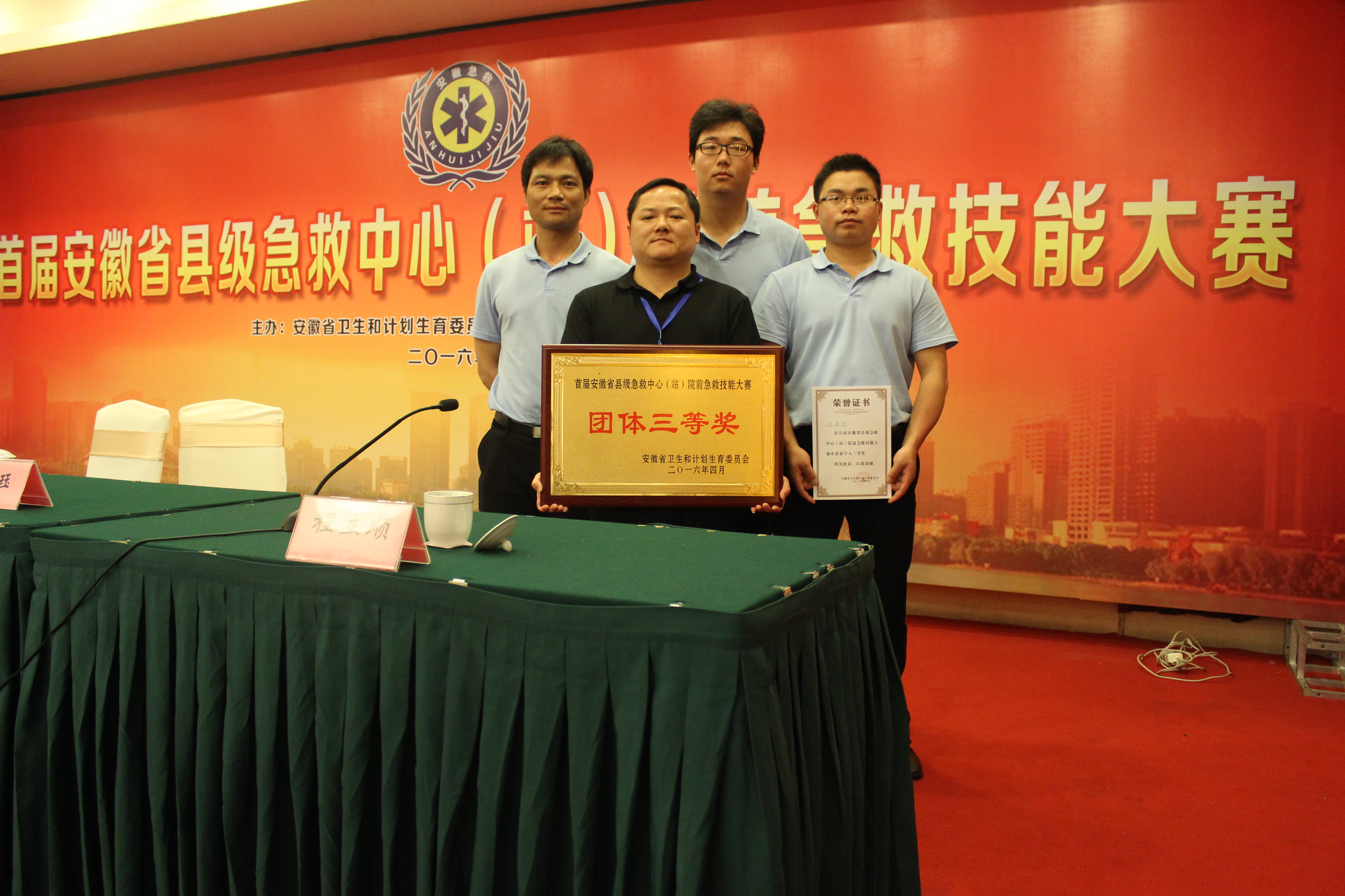 4月27-29日,首届安徽省县级急救中心(站)院前急救技能大赛在合肥隆重举行,全省16个市的35支县级急救中心(站)代表队共105名选手参加了本次大赛。经过三天紧张激烈的角逐,由我院桂玉坤、朱梁华、余本权三名选手组成的安庆市中医系统代表队荣获团体三等奖、朱梁华个人三等奖的佳绩。
