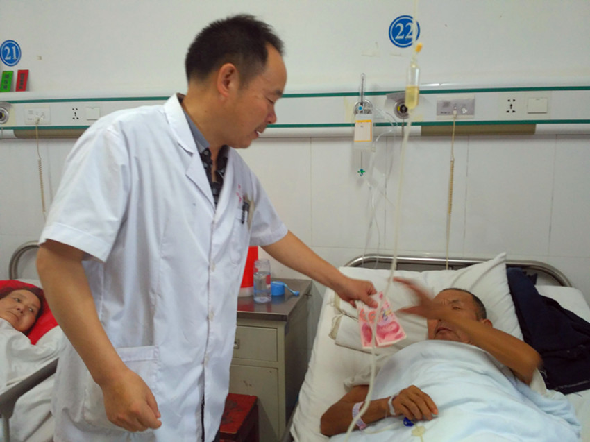 丁仕强是余井镇文治村建档立卡贫困户,8月14日因心衰入住我院内科。在得知帮扶贫困户住院后,结石科朱兴民主任及时赶到病房,与贫困户面对面交流病情,积极宣传住院补偿医疗救助及相关政策,叮嘱他一定要安心养病,有什么困难一定要及时联系,同时送上200元的生活费用。无独有偶,8月10号,该村贫困户刘焕新之子刘松因患结石入住县中医院结石科,该户帮扶责任人总务科占学农主任得知情况后,购买了慰问品,第一时间赶到病房看望,并要求患者要好好养病,积极配合医生治疗,有什么困难要及时联系他,并表示将竭尽全力的提供帮助。