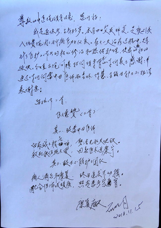近日,院办公室收到一位83岁老年患者的感谢信。感谢信情真意切,字里行间透露出对内二科医务人员这种爱岗敬业、视病人如亲人职业情怀的感激之情。现特将感谢信的原文刊出,希望全院医务人员继续树立和落实以病人为中心的服务理念,不断提高服务水平,切实提升群众就医获得感。