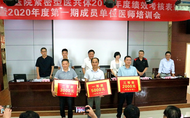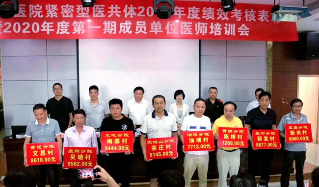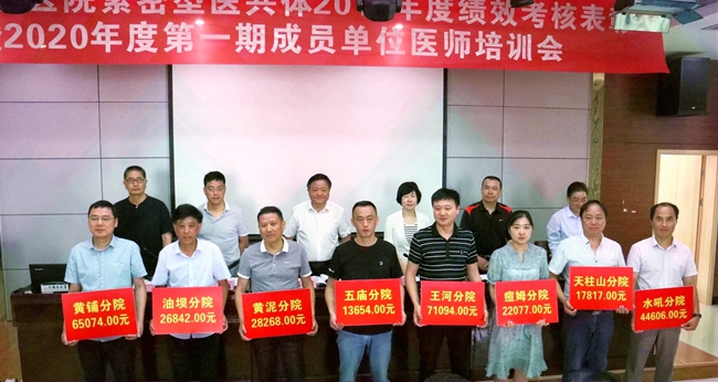 会议对2019年度紧密型医共体分院绩效考核成绩前3名及8个考核成绩优秀的村卫生室进行了表彰和奖励。此次表彰奖励,医院根据2019年度紧密型医共体牵头医院和分院绩效分配方案,就各分院及卫生室的分级诊疗、规范服务、医保统筹支付及基本公卫服务等重点指标进行了综合考核评分,为了充分发挥绩效考核激励、导向作用,对考核结果居前的先进单位及卫生室进行了表彰奖励。