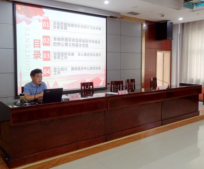 韩仁贵紧扣医院党建工作实际及多年来的自身工作经历,围绕加强党对医院工作的领导,从深刻把握我国各阶段医疗卫生体制改革发展,准确把握紧密型县域医共体建设的核心要义和基本思路,加强医院党建深入推进深化医改各项工作,围绕医改中心做好自身工作四个方面进行了深入浅出地阐述和解读。